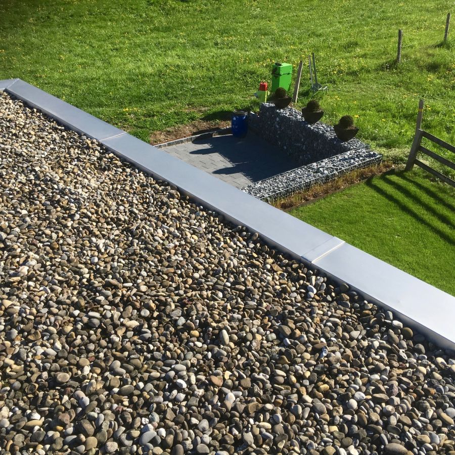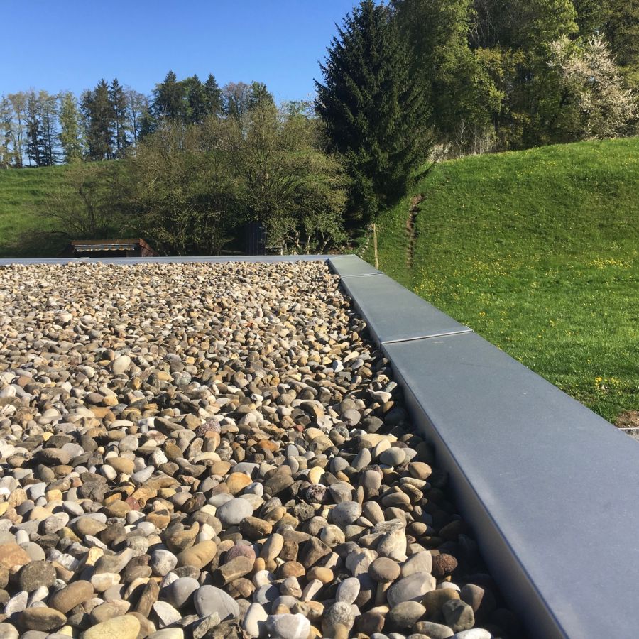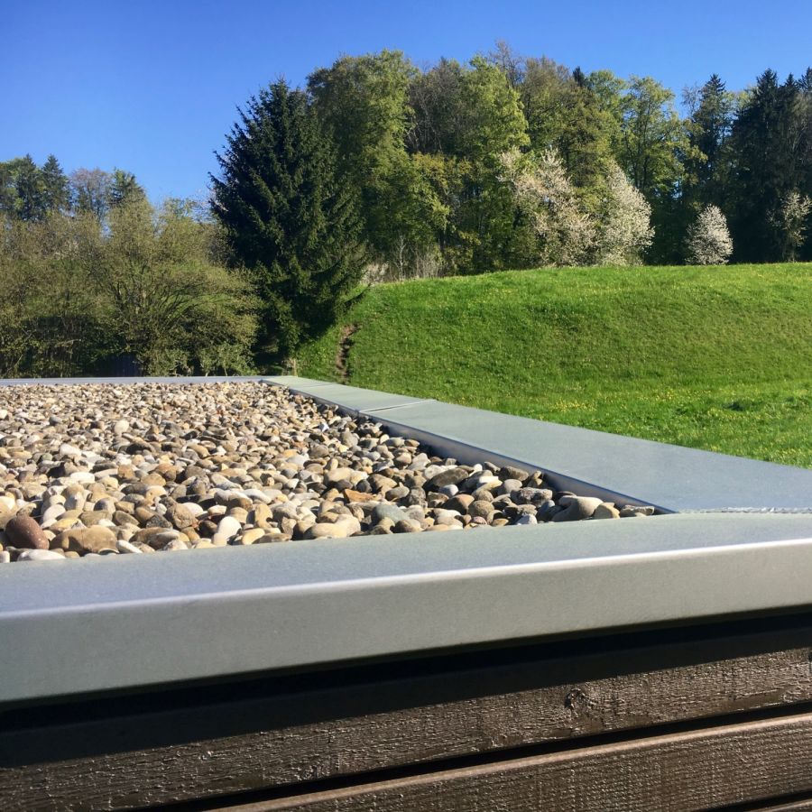 Das Flachdach, eine Dachform, die in der heutigen Zeit nicht mehr wegzudenken ist. Auch hier ist der Spengler wieder gefragt. Dachrandanschlüsse, Einfassungen, Schwellenanschlüsse, sowie das Abführen des Dachwassers, all dies sind Details, die durch den Spengler gelöst werden. Die Abdichtung eines Flachdaches erfolgt mittels Schwarzdach (bitumenhaltige Dachpappe) oder aus gummielastischen Bahnen (EPDM). Der Werkstoff EPDM (Contec) wird bei uns vor allem bei Carports eingesetzt. Das ganze Dach kann vorfabriziert werden und ist somit ab Erstellung der Unterkonstruktion dicht. Mit den Dachrandabschlüssen aus Blech entsteht so in kürzester Zeit ein langlebiges, formschönes Dach.