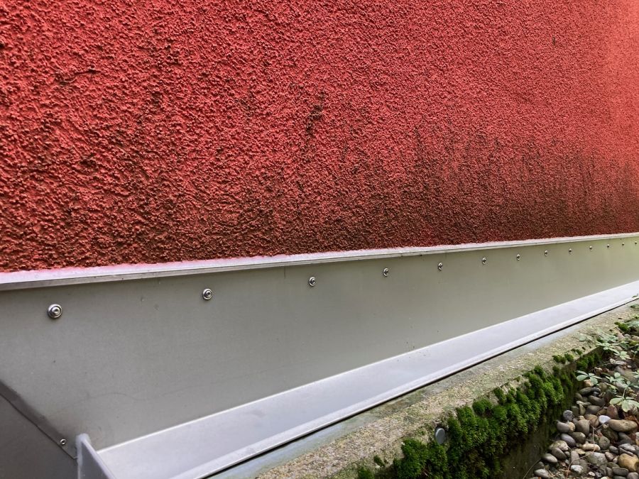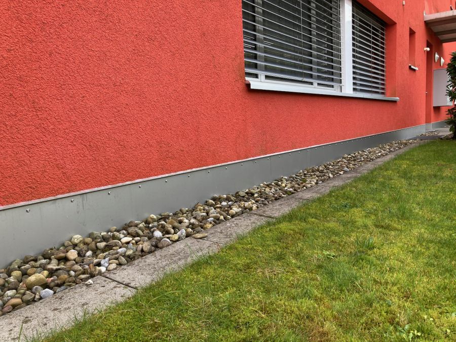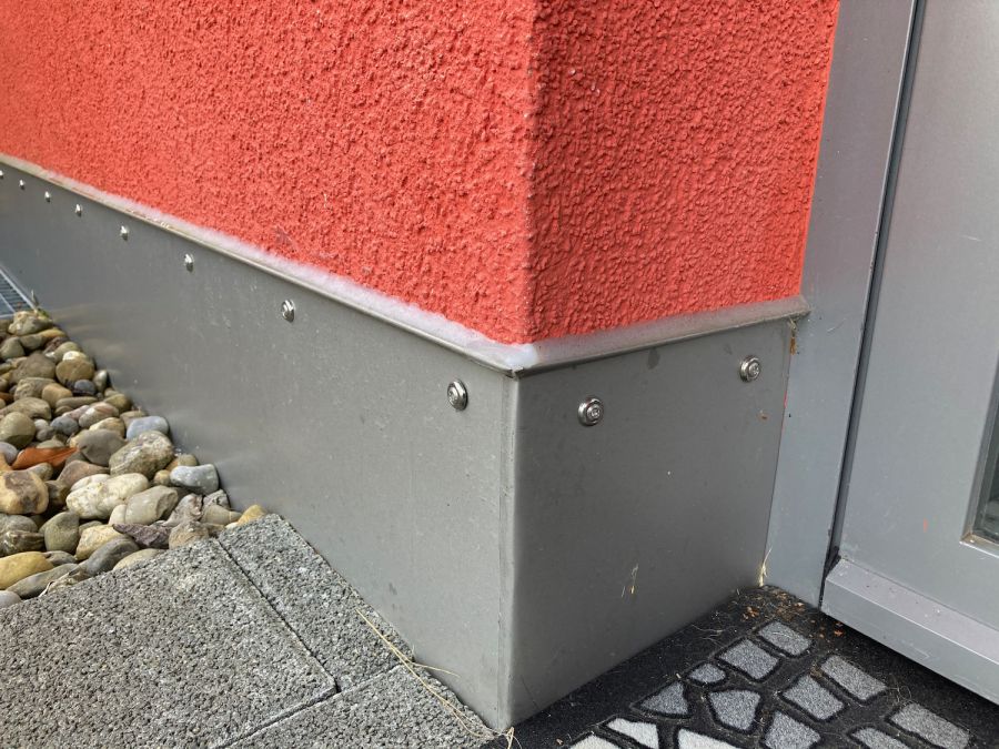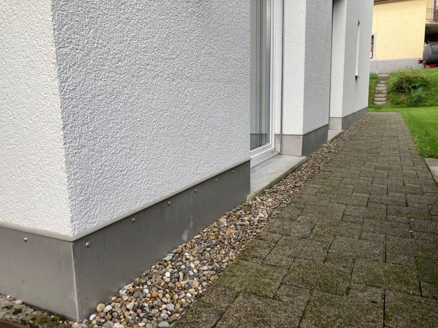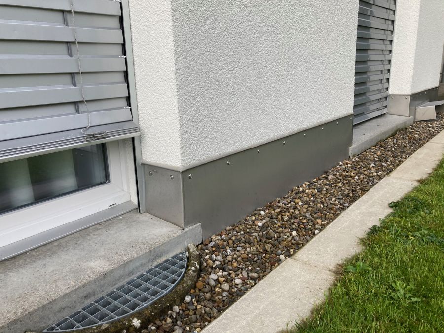 Der Fassadenabschluss ein wichtiges und häufig mangelhaft oder gar nicht ausgeführtes Detail. Fehlt das Sockelblech, so ist die Fassade anfällig auf mechanische Beschädigungen, welche wiederum Feuchtigkeit in die Dämmung einziehen lässt. Bei der Ausführung des Fassadenanschlusses muss zwingend ein Kapillarschnitt, welcher mit einem elastischen, feuchtigkeitsschützenden Material verfüllt wird, gemacht werden. Das darüber liegende Sockelblech dient als mechanischer Schutz der Fassade.